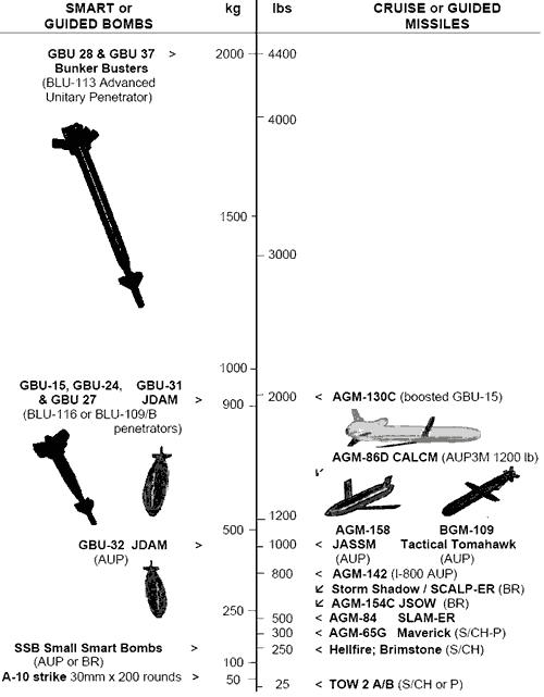 **Figure 2 - Hard target guided weapons in 2002: smart bombs & cruise missiles with "dense metal" warheads **(updated September 2002)